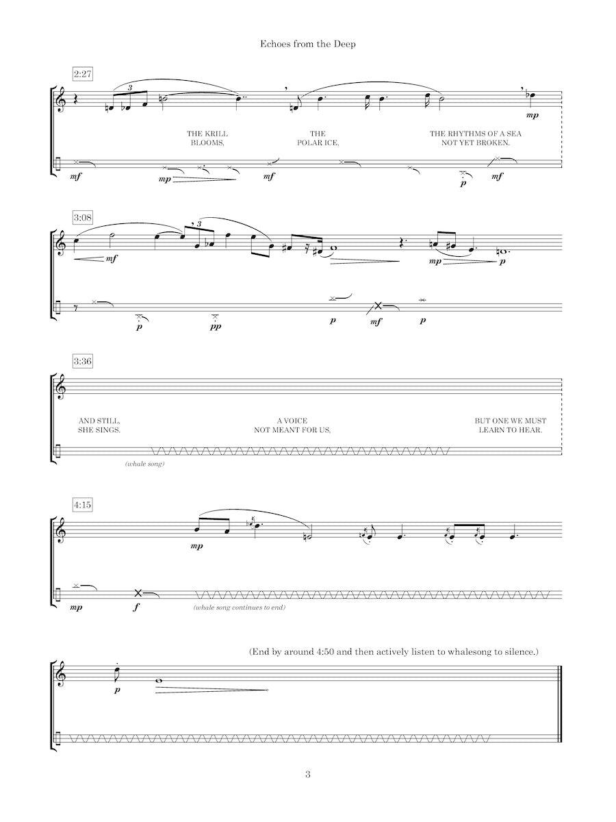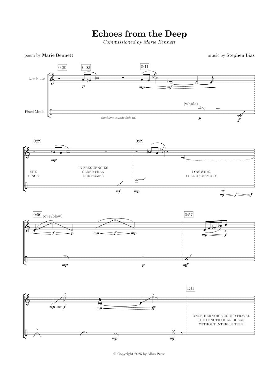 This work for any low flute and fixed media captures the mystery, longing, and fragility of our planet's largest mammals. The flute interacts with the soulful calls of a humpback whale and the evocative poetry of Marie Bennett.